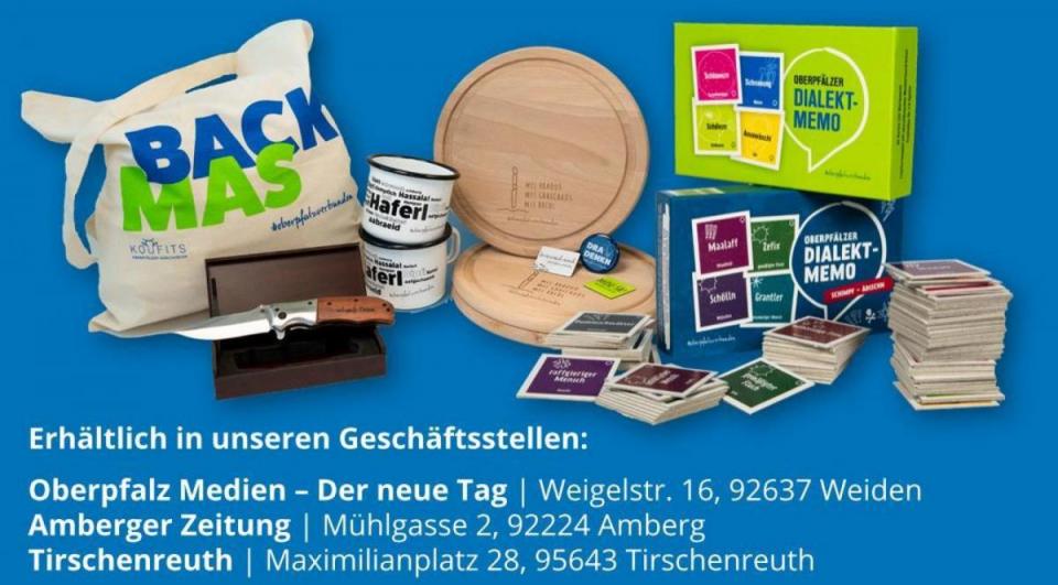 Unsere Oberpfalz-Memos sowie viele weitere „Dialekt-Produkte“ wie die Emaille-Tasse, das Brotzeit-Bredl und Brotzeitmesser „Schoafs Drum“, unserer Schirm „Sauweda“ oder das Magnetset (Dra Denkn, Mou sa, Bressiad niard) sind ein echter Hingucker.