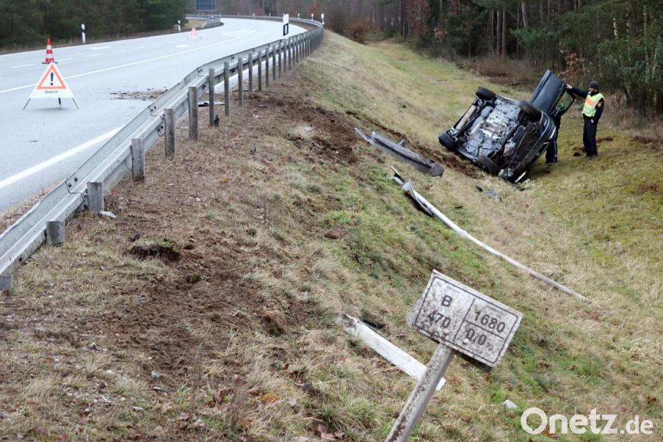 Nach dem Zusammenstoß rutschte der Seat auf eine Schutzplanke und schlitterte dort etwa 20 Meter weiter. Danach kippte das Fahrzeug nach rechts die Böschung hinab und überschlug sich. Auf der Fahrerseite blieb der Wagen schließlich liegen.