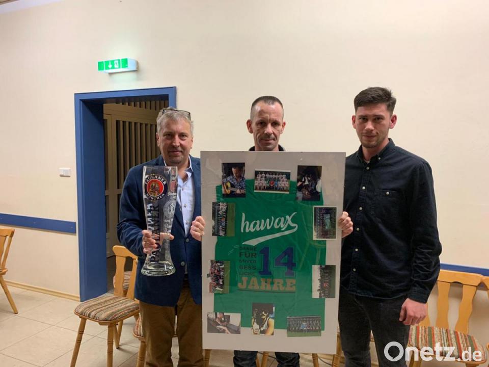 Zum Ende der Feier musste der Vorsitzende eine "traurige Pflicht", die Verabschiedung von Thomas Hartinger, der sich die letzten 14 Jahre um den Getränkeverkauf im Sportheim gekümmert hat, vornehmen. In seiner Laudatio bedauerte Becher den Rücktritt und würdigte die Verdienste. Mit einem überdimensionalen Weizenglas mit Gravur bedankte er sich beim "Sportheimwirt", die Seniorenmannschaften schlossen sich mit einem weiteren Erinnerungsgeschenk an.