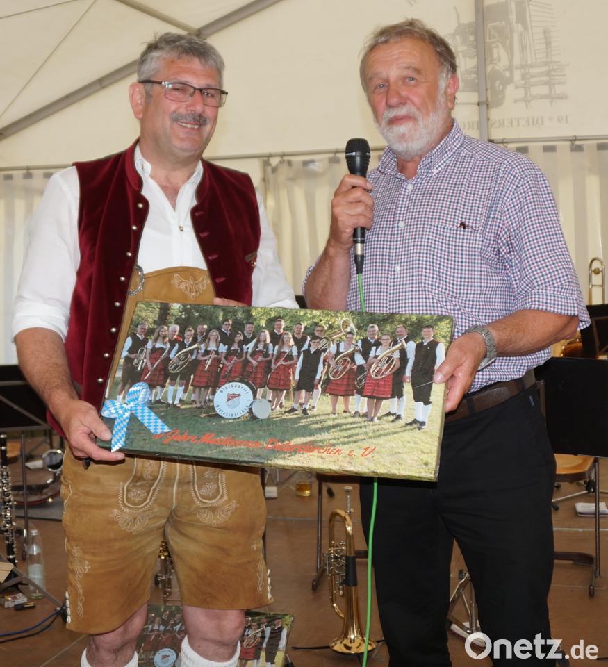 Sie erhielten für ihre fünf Stücke mit Marsch, Polka, einem Medley von Queen und der Titanic-Titelmelodie viel Applaus. Mit Ehrungen wurde den vielen aktiven und passiven Mitgliedern gedankt, die seit zehn Jahren dem Musikverein die Treue halten. Georg Bergschneider und Johann Graßl dankten ihnen und überreichten ein Bild der Blaskapelle. Graßl hatte natürlich auch ein Bild für Bergschneider, der als Motor des Musikvereins wirkt, und sprach ihm ein herzliches Vergelt's Gott aus.