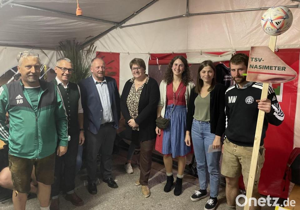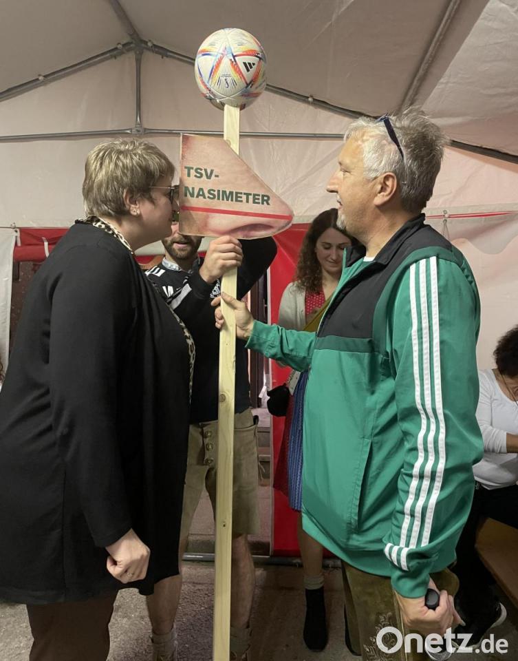 Als dann Vorsitzender Robert Becher, die Bürgermeisterin Anita Forster und ihre Stellvertreter Richard Brunner und Thomas Köppl auf die Bühne bat, beziehungsweise „trieb“, war die Spannung unter den Anwesenden groß.“ Wie lange sind die Nasenlängen dieser drei, wenn man sie addiert und wer hat das längste Riechorgan?“, war die Schätzaufgabe für die Gäste. Max Weingärtner und Angelika Lottner brachten mit dem „TSV-Nasimeter“ die Lösung. Zuvor mussten die drei Gemeindevertreter noch mit "Schnupfen, Schnäutzen und Riechen“ ein kurzes nasales Aufwärmprogramm durchlaufen.