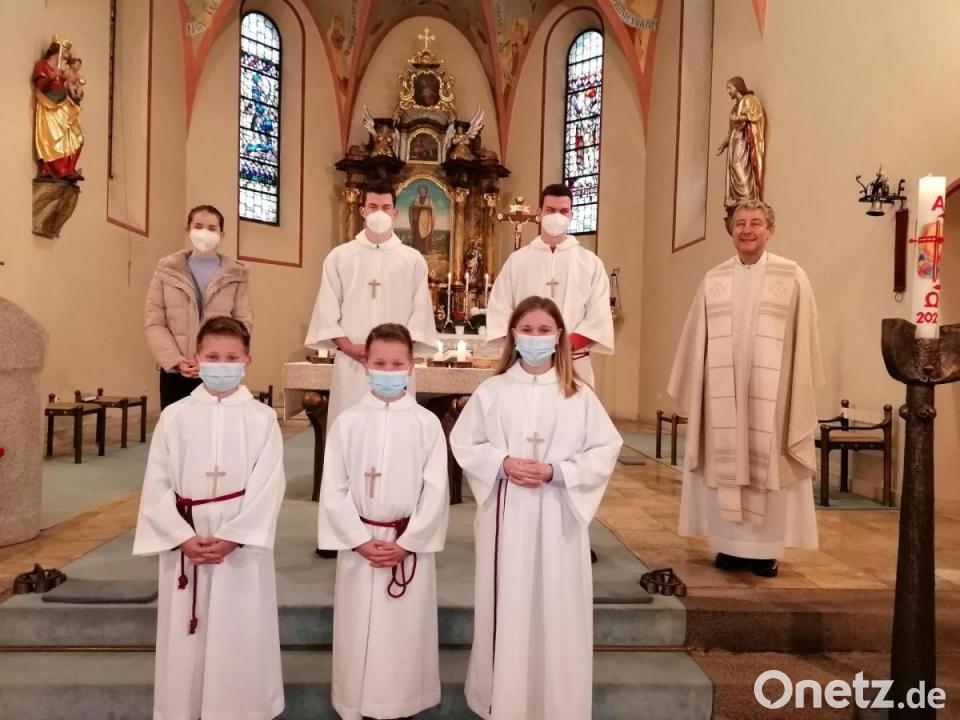 Ganz im Zeichen der Neuaufnahme und Verabschiedung von Ministranten stand der Gottesdienst am Christkönigssonntag in der Jakobuskirche der Expositur Döllnitz. Pfarrer Adam Nieciecki begrüßte Moritz und Jonas Rieder mit dem Segen in der Reihe der Ministranten, zu der auch Max Beierl jetzt gehört. In den vergangenen Wochen waren sie schon von den beiden Oberministranten gut auf ihre Aufgaben und Tätigkeiten vorbereitet worden. Anschließend bedankten sich Pfarrer Nieciecki und Pfarrgemeinderatsvorsitzende Annemarie Maier mit Aufmerksamkeiten bei den ausscheidenden Ministranten. So war Antonia Kleber sieben Jahre als Ministrantin tätig, Kathrin Simon fünf Jahre. Zehn Jahre waren es bei Matthias und Thomas Stangl, die auch das Amt der Oberministranten ausübten. Künftig ist Leonie Rieder die Oberministrantin.