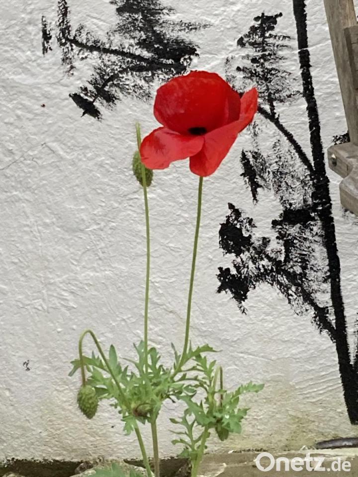 Was ist hier pure Natur und was ist Malerei, so kann man fragen, wenn man die Blüte vor dem schwarzen Gebilde sieht. Diese Mohnblume ist ohne menschlichen Zutun im Topf aufgegangen und sie zeigt jetzt ihre wunderbare rote Blüte. Es ist immer noch Spätherbst und viele Blumen blühen noch, vor allem Rosen, Zinnien und auch noch Stockrosen, da es noch keinen starken Frost gab und so leuchtet das Rot in einem Naturgarten.