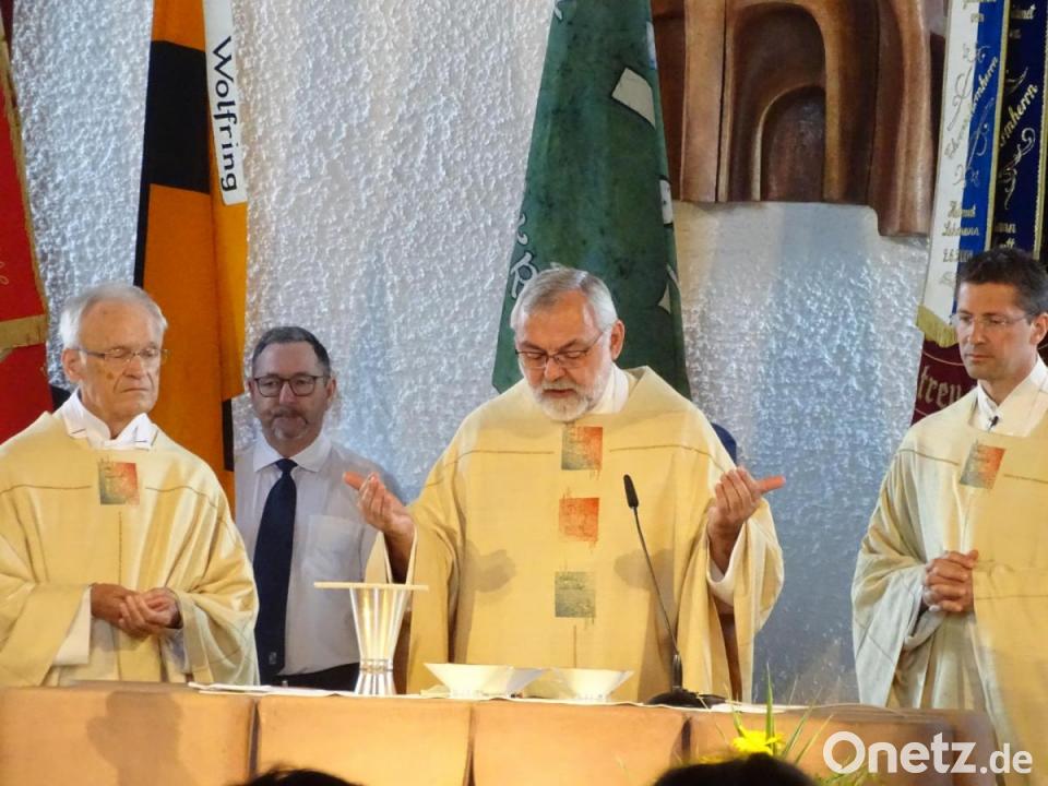Als die Glocken verhallt waren und auf dem nahen DJK-Gelände die weltliche Kirchweihfeier begonnen hatte, blieben nur wenige Stunden bis zum nächsten festlichen Ereignis. Es startete am Sonntag mit einem Kirchenzug durch Dürnsricht, an dem sich die Fensterbacher Blaskapelle, Vereinsabordnungen mit ihren Fahnen, die drei Bürgermeister und die Kirchenverwaltung mit Kirchenpfleger Günter Schießl an der Spitze beteiligten. Ein seltenes Ereignis für das gesamte Dorf und eine Gelegenheit, sich einzureihen, um Dank zu sagen für 60 Jahre im Zeichen engagierter Seelsorge. Am Altar standen Ruhestandspfarrer Hans Schächtl und der amtierende Dürnsrichter Pfarrer Michael Hoch. Zwischen ihnen hatte an diesem Morgen der aus Deggendorf angereiste Priester Martin Neidl seinen Platz. Der gebürtige Wolfringer hielt die Festpredigt und tat das vor einem voll gefüllten Gotteshaus.