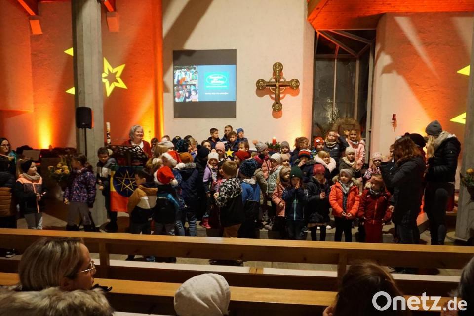 Ruhigere Weisen schlug das Ehepaar Ulla und Franz Weiß mit Hackbrett und Akkordeon an. Die Schulkinder hatten den kompletten Orgelblock besetzt und sangen gut aufgelegt - zusammen mit Schulleiterin Ulrike Erlbacher, die sie auf der Gitarre begleitete - fröhliche Weihnachtslieder mit rhythmischer Unterstützung. Das Märchen von Thane, der aus den Sonnenfünkchen des Tages den Mond und die Sterne für die Nacht erschuf und so die Kinder im Land der großen weißen Wolke davor beschützte, dass sie im Dunkeln in den See fielen oder sich die Köpfe an den Bäumen aufschlugen, sorgte für glänzende Kinderaugen.
