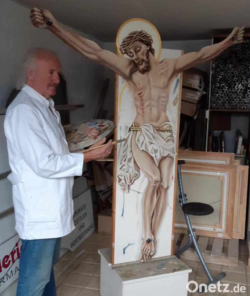 Spätestens dann können die Menschen auch das neueste Werk des Künstlers betrachten, das einen besonderen Platz im Eingangsbereich der Kirche erhalten wird. Das Kreuz, das dort seit mehr als 50 Jahren hing und den malerisch dargestellten gekreuzigten Christus zeigte, war mittlerweile von Wind und Wetter arg in Mitleidenschaft gezogen worden. Die Kirchenverwaltung beauftragte daher den ortsansässigen Künstler Hierl, hier etwas Neues zu erschaffen. Hierl empfand diese Beauftragung als besondere Wertschätzung seiner künstlerischen Arbeit und machte sich ans Werk. Die neue Christusdarstellung wurde von ihm in Lebensgröße sehr facettenreich auf eine wetterbeständige Aluplatte gemalt. Sehr detailverliebt bezeugt das Werk eindrucksvoll das Leiden und die Erlösung Christi. Die so genannte sakrale Kunst ist seit vielen Jahren zu einer von Hierls Leidenschaften geworden. Im ganzen Landkreis sind zahlreiche weitere Kreuzigungsdarstellungen zu finden, unter anderem in Raigering und Pittersberg. Hier wurde Christus jeweils mit der schmerzhaften Madonna gemalt.
