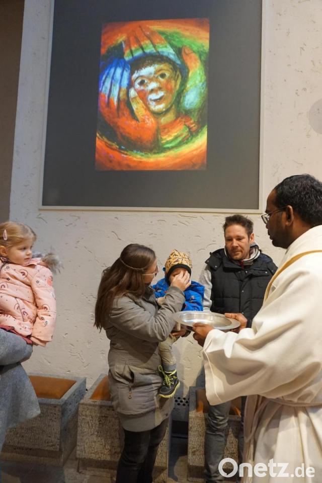 Kathrin Blödt bezog sich auf das im Hintergrund eingeblendete Bild aus der Feder des Priesters Sieger Köder, das ein Kind zeigte, dessen Kopf geborgen in zwei zart umschließenden Händen liegt. Es versinnbildliche, dass alle geborgen in Gottes Hand liegen. Pfarrer Sagai lud alle Familien ein, sich um den Altar zu versammeln und sowohl den Kindern als auch sich selbst mit geweihtem Wasser das Zeichen des Kreuzes auf die Stirn zu zeichnen. Damit erinnerten sich auch die Eltern an ihre eigene Taufe und ihr bewusstes christliches Vorbild für ihre Kinder.