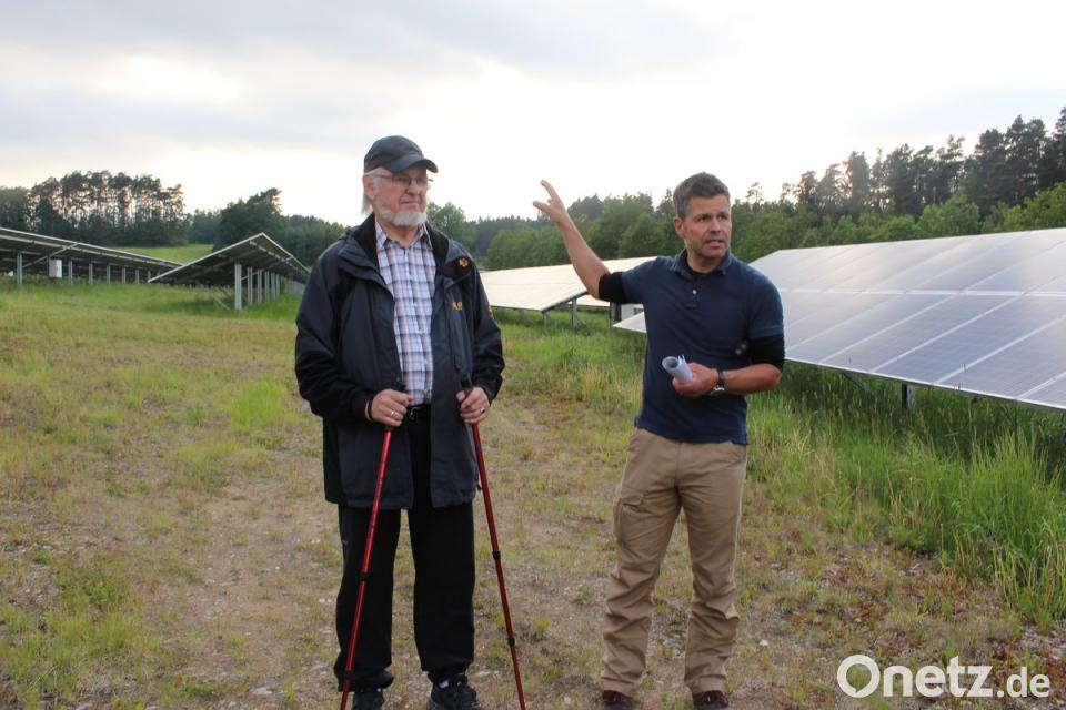 (dwi) Über Energie und deren wirtschaftlichen Faktor, Hürden und von Bürokratie erzählt der Freiherr bei einer "Watt"-Wanderung. Über vier Hektar inklusive Austauschflächen misst der Grund auf dem Hubertus von Eyb vor fünf Jahren seine PV-Anlage bauen ließ. 7720 Solar-Module produzieren zu Höchstzeiten Strom für den Großteil der Haushalte in Ebermannsdorf - etwa 1,8 Millionen Kilowattstunden jährlich. Jetzt bestätigt sich der mühsame Weg von der Idee bis zur Umsetzung für den Besitzer. "Eines würde ich anders machen", erzählte Hubertus von Eyb. "Ich würde die Fläche vor Bebauung pflügen und Sportrasen sähen." Denn, anders als viele Gegner der PV-Energie denken, das Kraut wächst, auch unter den Modulen. Es muss regelmäßig entfernt werden.