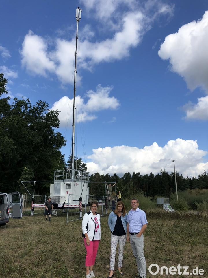 (exb) Bis der am endgültigen Standort steht und in Betrieb gehen kann, wurde jetzt direkt gegenüber ein 25 Meter hohes Provisorium errichtet. Es dient vor allem der Versorgung entlang der Autobahn und soll in den nächsten zwei Wochen ans Netz gehten. Diese Lösung soll kurzfristig Abhilfe für Empfangs-Probleme im Bereich der Autobahn und in einem Teil des Dorfs schaffen. "Wir haben uns, nach vielen Gesprächen und Beratungen im Gemeinderat, mit der Telekom auf diesen Standort geeinigt", sagte Bürgermeister Josef Gilch bei einem Ortstermin mit Vertretern der Telekom. Jetzt sei eine Lösung gefunden, "die am weitesten alle Interessen unserer Bürger berücksichtigt."