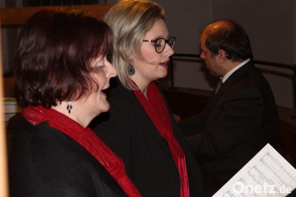 Von der Empore sangen Nadine Prechtl und Karin Kuhbandner, begleitet von Martin Kopp an der großen Hey-Orgel, „Es hatte sich eröffnet das himmlische Tor“, ein Lied aus der Steiermark, in dem die Engel vor Freude über Christi Geburt aus dem offenen Himmelstor purzeln und sich die Hirten aufgrund dieses Anblicks mit Brotzeit und Fackeln auf den Weg machen, um dem Christkind ihre Gaben zu bringen, und brillierten mit „Fröhliche Weihnacht überall“ in einem Satz des britischen Komponisten Christopher Tambling.