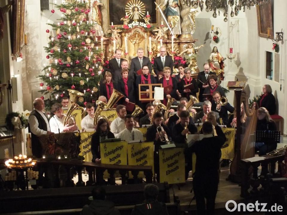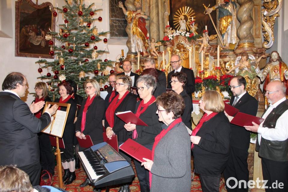 Die Männerstimmen des Kirchenchors folgten mit der schlesischen Weise „O Freude über Freude“ (Tonsatz: Alfred Lohmann). Danach stimmte der Kirchenchor mit „Ich bete an die Macht der Liebe“ eines der bekanntesten russischen Weihnachtslieder von Dimitri Bortnianski in einer Bearbeitung von Gerhard Kuhbandner an. Die Stimmung nahm die Fichtelgebirgskapelle mit der Tiroler Weise „Es wird scho glei dumpa“ auf. Dem schwungvollen „Bozner Hirtenlied“ der Bläser folgte der Kirchenchor mit „Engel auf den Feldern singen“.