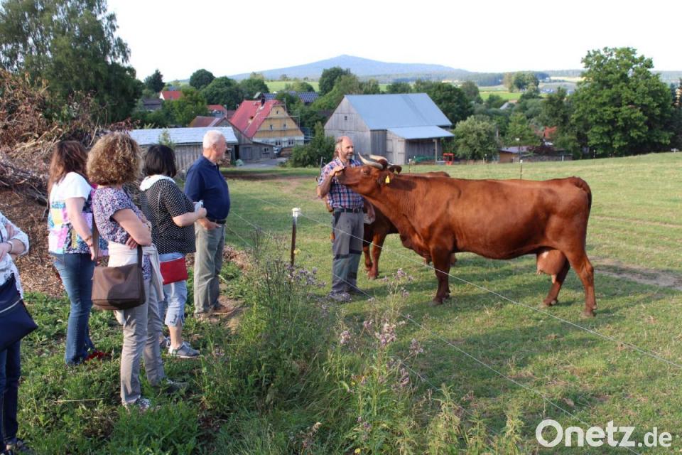 Karolin und Hermann Köstler erklärten die Philosophie, die hinter „Demeter“ steht, und warum sie sich dafür entschieden haben. Es würden kein Kunstdünger und auch keine Spritzmittel verwendet. Daraus ergebe sich eine sehr naturnahe Bewirtschaftung, die von vielen Kunden geschätzt werde, erklärten sie. Ein Highlight der Führung war die Besichtigung der Rotviehherde, eine Rasse die auch besonders gut für den Steinwald geeignet ist, weil sie die klimatischen Verhältnisse gut aushalten kann. Die Tiere verbringen einen Großteil ihrer Lebenszeit auf der Weide, was für eine besonders gute Fleischqualität sorgt.