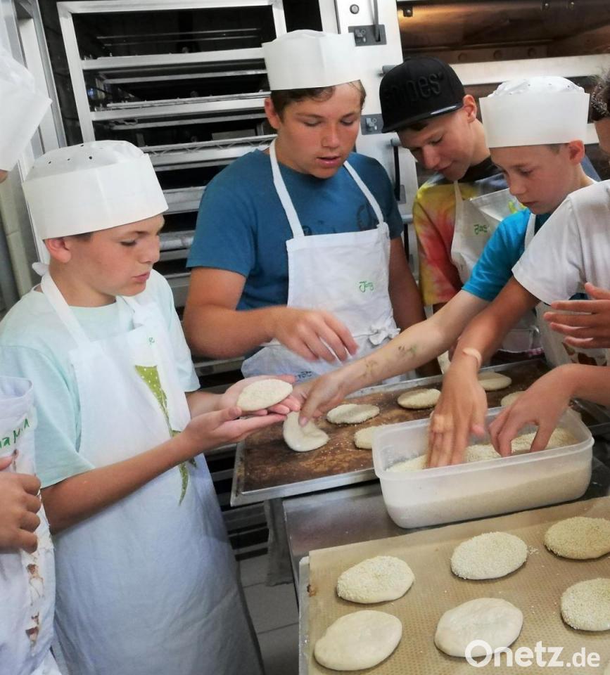 Die Meister Eberhard Söllner und Tobias Göhl stellen zu Beginn vor, was am Vormittag auf dem Programm steht. Die Schüler staunen nicht schlecht, als sie hören, dass sie selbst Brotteige herstellen und backen dürfen. Nachdem die Jugendlichen die Schürzen angelegt und Mützen aufgesetzt haben, geht es auch schon mit den Vorbereitungen in der Backstube los. Alle sind fleißig bei der Arbeit. Die Schüler wiegen Zutaten ab und kneten Teige. Bäckermeister Söllner will wissen, welche Zutaten für ein Brot benötigt werden. "Weizenmehl, Roggenmehl, Salz, etwas Hefe, Wasser und das Wichtigste, der Natursauerteig", zählt Söllner auf. Damit die Schüler verschiedene Mehlsorten kennenlernen, hat Bäckermeister Göhl ein Experiment vorbereitet. Die Schüler dürfen einen Teig aus Roggenmehl und einen Teig aus Weizenmehl mit den Händen kneten. So können sie erkennen, wie sich bei der Verarbeitung Aussehen und Beschaffenheit aufgrund der Mehlsorten unterscheiden. In Schüsseln vorbereitete Gewürze, Kräuter und verschiedene Mehltypen dürfen die Schüler durch Anfassen und Riechen erraten. Im Laufe des Vormittags stellen die Jugendlichen mit der Unterstützung der Bäckermeister Brezen, Bürgersemmeln, Bärlauchstangen und Pizzen her. Bevor die Klasse den Nachhauseweg antritt, dürfen sich die fleißigen Schüler zur Belohnung die Pizzen schmecken lassen.