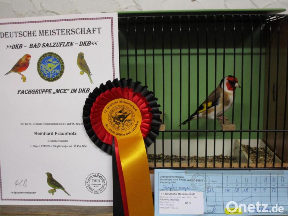 Alle Stieglitze müssen vom Züchter bei der Unteren Naturschutzbehörde mit Ringnummern gemeldet und mit einem geschlossenen Ring, der die Verbandsnummer, die Vereinsnummer und die Jahreszahl enthält, versehen werden. Die Siegerliste von Reinhard Fraunholz mit seinen Vögeln war im vergangen Jahr wieder lang. Bei den Ausstellungen in Bodenmais, Philippsburg und Bad Salzuflen gab es jeweils nur erste Plätze zu verzeichnen: Championskollektion von vier farbengleichen Vögeln in Kanarienweiß rezessiv (370 Punkte), Championssieger Einzelvogel Kanarie dominantweiß (94 Punkte), Schauklassensieger Waldvögel mit russisch Stieglitz-Mayor (368 Punkte), Grünling natur (366 Punkte), die besten fünf Einzelvögel (459 Punkte), bei der Farbkanarienschau in Philippburg bester Stammlipochom weißrezessiv (374 Punkte).