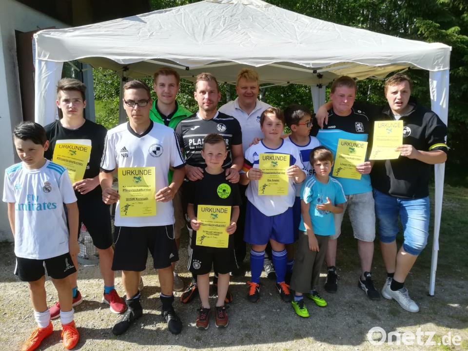 Ebnath. (soj) Auch dieses Jahr richtete die DJK wieder das traditionelle Pfingst-Pokalturnier zu Ehren des verstorbenen Altbürgermeisters Albert Ritter aus. Bei dem Fußball-Gauditurnier wurde auf einem Kleinfeld in zwei Gruppen gespielt, wobei die Begegnungen jeweils acht Minuten dauerten. Acht Mannschaften nahmen an dem Turnier teil. Das Endspiel bestritt schließlich der Burschenverein Ebnath gegen eine Mannschaft des SVSW Kemnath. Hier gingen die Kemnather mit 2:0 als Sieger hervor. Auf den weiteren Plätzen folgten „Die Angler“ und die „Balkenmäherfreunde Fichtelnaabtal“. Das Turnier, dass im Rahmen der Feierlichkeiten zum 90-jährigen Bestehen stattfand, lockte wieder viele Zuschauer auf das Sportgelände der DJK. Nach der Siegerehrung saßen die Teilnehmer bei herrlichen Sommerwetter noch lange auf der Sportheimterrasse zusammen, um über die ein oder andere spannende Szene nochmals zu diskutieren.