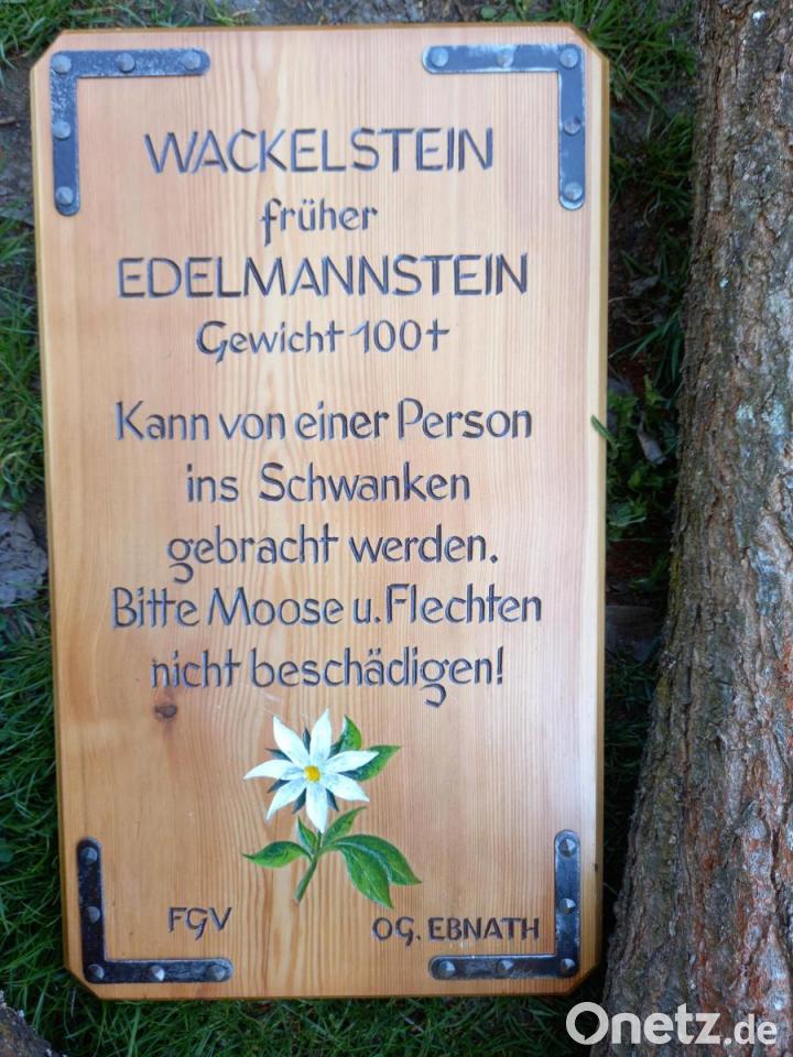 In Rainhold Seidel aus Tröstau fand FGV-Vorsitzender Martin Exner einen Künstler, der in eine Platte aus Lärchenholz die neue Inschrift schnitzte und mit einem Siebenstern verzierte. Die Beschreibung lautet: „Wackelstein früher Edelmannstein, Gewicht 100 t, kann von einer Person ins Schwanken gebracht werden. Bitte Moose u. Flechten nicht beschädigen! FGV OG Ebnath.“ Zur Fixierung im Boden steuerte die Firma Wartinger eine Edelstahlverankerung bei und die Firma Plannerer spendierte eine Abdeckung zum Schutz vor Regen. Wegewart Gerd König montierte noch zwei Tafeln, die auf die nächstgelegenen Zielorte hinweisen.