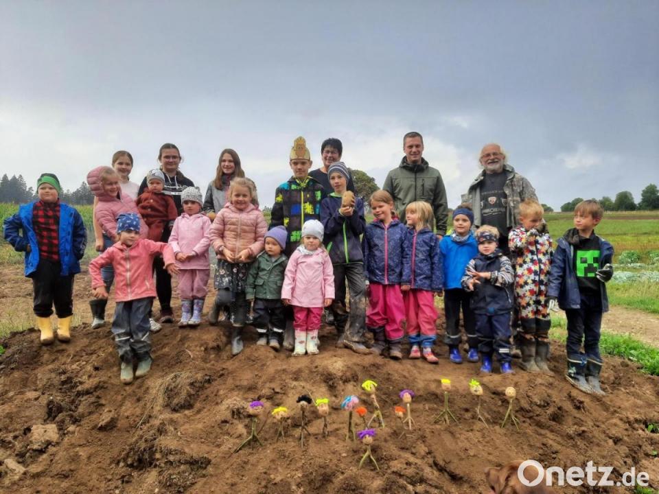 Die Kinder waren mit Begeisterung beim Kartoffelfeuer dabei. Mit dabei waren unter anderem (hinten, von rechts) FGV-Vorsitzender Martin Exner, Bürgermeister Wolfgang Söllner und Irene Pöllath von der Dorfgemeinschaft Hermannsreuth. Mit im Bild der neue "Kartoffelkönig" mit Krone Jeremias Küspert.
