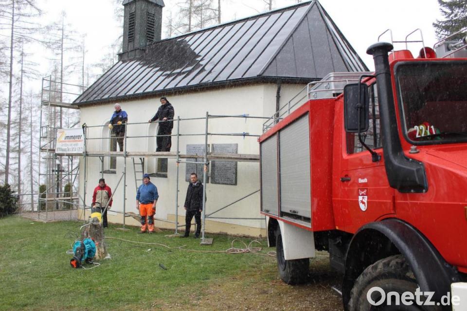 Zunächst wurde ein Gerüst von der Firma Zimmerer aus Neusorg aufgebaut. Am Wochenende übernahmen Stefan Kausler, Hubert Becher und Rudi Rubenbauer die Reinigung des Außenputzes, der Treppe und der Dachrinne mit dem Dampfstrahler. Sie entfernten den Schmutz und das Moos. Da die Kapelle über keinen Wasseranschluss verfügt, stellte Bürgermeister Wolfgang Söllner den alten Feuerwehrunimog zur Verfügung. Gemeindemitarbeiter Alexander Schmidt hatte Hubert Becher die Funktionen des Gemeindeunimogs erklärte.