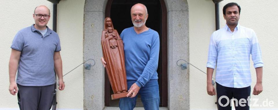 Eine aus Kirschholz geschnitzte Wandfigur ziert seit wenigen Tagen das Innere der Kalvarienbergkapelle. Die Figur zeigt die Muttergottes mit Kind. Die circa 80 Jahre alte Holzfigur war in den vergangenen Jahren im Familienbesitz von Bernd Würstl. Jetzt, am Ende der Renovierungsarbeiten auf dem Kalvarienberg, spendete er die Figur für die idyllisch gelegene Kapelle. Pfarrer Pater Anish George und Kirchenpfleger Stefan Kausler bedankten sich im Namen der Pfarrei für das wertvolle Geschenk. Die Kapelle ist immer wieder ein beliebter Anlaufpunkt für viele Wanderer und Fahrradfahrer. Wie Pfarrer Pater Anish George erwähnte, ist die Kapelle täglich von 10 Uhr bis 18 Uhr geöffnet. Hier galt sein Dank besonders Horst und Isabella Buchwald, die die Kapelle täglich öffnen, sie sauber halten und pflegen. Der Dank des Geistlichen und des Kirchenpflegers Stefan Kausler galt auch der Kolpingsfamilie, die sich um das Umfeld rund um die Kapelle kümmert.