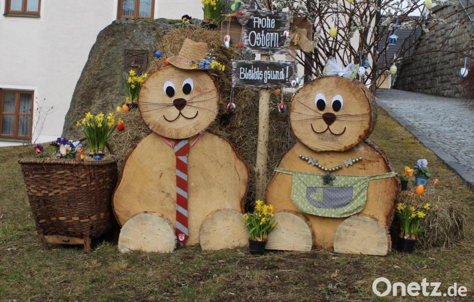 Das Osterfest rückt näher. Das merken Fußgänger oder Kirchenbesucher in Ebnath. Beim Aufgang zur Kirche wurde ein Osterhasenpaar aufgestellt, es wurde aus großen Holzscheiben gebastelt. Die Feuerwehrkommandanten Gerhard Horn und Michael Knott haben diese zurechtgesägt und zusammengebaut. Die Hasendame ist circa einen Meter groß. Für sie wurden aus Stoff eine Schürze und eine Schleife fürs Haar angefertigt. Natürlich darf für die Hasendame auch der passende Schmuck nicht fehlen. Der Hasenmann ist circa 1,2 Meter groß. Als Sonnenschutz bekam er einen Hut mit Blumen. Eine Krawatte aus Holz, versehen mit dem Wappen der Gemeinde Ebnath, ziert dessen Hasenkörper. Der Hase hat natürlich auch einen Korb mit Ostereiern und Blumen dabei. Auf einem angebrachten Schild steht der Ostergruß: „Frohe Ostern und bleibts gsund!“ Abgerundet wird das Kunstwerk von Heuballen, Blumen, Ostereiern und einem großen Strauß aus Palmkätzchen. Nachdem die Hasen bei der Familie Knott auf dem Oestelberg zusammengebaut und geschmückt worden waren, hat sie Josef Söllner mit dem Traktor zum Marktplatz gebracht. Dort warteten mit Monika und Gerhard Horn, Nadine Prechtl mit Tochter Sophie, Rudi Rubenbauer und Carolin Knott weitere Helfer, um das Kunstwerk zu drapieren und den restlichen Schmuck anzubringen. Selbst Bürgermeister Wolfgang Söllner packte mit an. Der Gemeindechef bedankte sich für das Engagement der Helfer. Bert Flor, der die Aufbauaktion aus der Nachbarschaft beobachtet hatte, war so angetan von dem Engagement der fleißigen Helfer, dass er jedem spontan eine Flasche Rotwein überreichte. Die Blumen spendete wieder Blumen-Becher aus Ebnath. Das Holz steuerte Thomas Pelzer bei.
