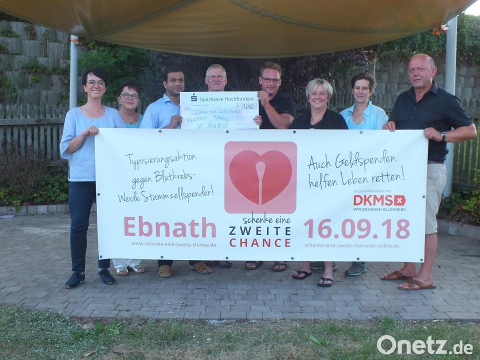 (soj) Das Pfarrfest der Pfarrei St. Ägidius Ebnath war in diesem Jahr ein voller Erfolg. Zahlreiche Gäste waren in den Pfarrhof gekommen. Nicht nur das schöne Sommerwetter, auch die beabsichtigte Verwendung des Erlöses aus dem Fest dürften Anlass gewesen sein, dass so viele Menschen das Pfarrfest besuchten. Der Erlös sollte der Typisierungsaktion, die am 16. September 2018 in der Schule in Ebnath ansteht, zur Verfügung gestellt werden. Jetzt hatte der Pfarrgemeinderat abgerechnet, 970 Euro waren am Ende übrig geblieben. Die Pfarrei rundete auf einen Betrag von 1000 Euro auf. Pfarrgemeinderatssprecher Hans Enders und seine Stellvertreterinnen Marita Kuchenreuther und Daniela Würstl übergaben beim Kolpinggrillfest einen Spendenscheck. Die Initiatoren der Typisierungsaktion „Schenke ein zweite Chance“, Johannes Bauer, Sandra Schmelber, Karin Pöllath und Josef Söllner, waren überwältigt. Stellvertretend für alle bedankte sich Johannes Bauer für die große Spendenbereitschaft. Bereits am Fest sei der große Zusammenhalt spürbar gewesen. So trugen nicht nur Mitglieder des Pfarrgemeinderates und der Kirchenverwaltung zum Gelingen des Festes bei. Auch der Kindergarten, die Fichtelgebirgskapelle sowie viele Freiwillige halfen bei der Vorbereitung des Pfarrfestes mit. Die Initiatoren der Aktion „Schenke eine zweite Chance“ bedankten sich nochmals für die großartige Unterstützung.
