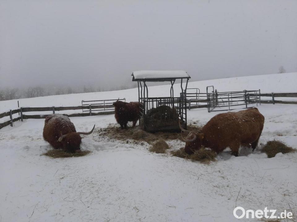 Das Wetter ist ihnen egal. Den Schottischen Hochlandrindern auf dem Kalvarienberg in Ebnath machen der viele Schnee und die winterlichen Temperaturen sichtlich nichts aus. Im Gegenteil, sie fühlen sich bei solchen Wetterlagen wohler als in der großen Sommerhitze. Und auch Regenwetter nehmen sie in aller Gelassenheit hin. Drei Mutterkühe, die auf der ganzjährigen Weide ihren Lebensabend verbringen dürfen, sind für viele Spaziergänger immer wieder ein schöner Anblick. Das Schottische Hochlandrind, auch Highland Cattle genannt, ist eine Rasse des Hausrindes. Diese Rasse stammt aus dem Nordwesten Schottlands. Das kleinwüchsige und relativ leichte Hochlandrind gilt als gutmütig, robust und langlebig. Beim näheren Umgang mit den Tieren ist aber durchaus Respekt vor den langen Hörnern geboten.