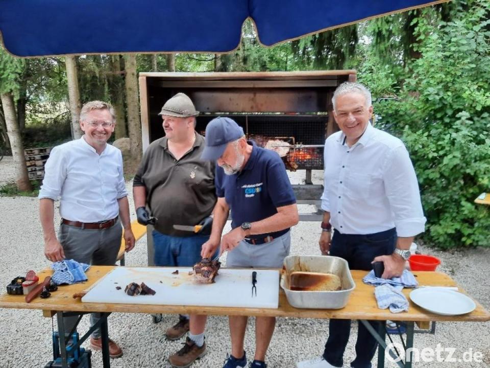 MdL Tobias Reiß (von links), Zweiter Bürgermeister Michael Sticht, Rudi Rubenbauer und Landrat Roland Grillmeier beim Zerlegen der Sau vom Spieß.