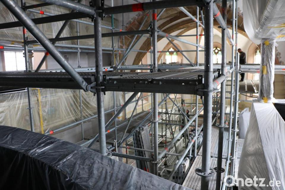 Die Arbeiten an der Außenfassade sind bereits erledigt. Rissbildungen im Übergangsbereich der Chorwände zum Kreuzrippengewölbe, Feuchteschäden im Sockelbereich an den Langhauswänden und in der Sakristei, der schlechte Zustand der Kirchenbänke auf den Emporen sowie die Ablösungen der Farbschichten an den Empore-Brüstungen sind teils schon behoben. Die Elektroinstallation, die Heizungssteuerung und Beleuchtung zeigen Fortschritte. Einige Gerüste für die Restaurierung der Wand- und Deckenflächen sind inzwischen abgebaut.