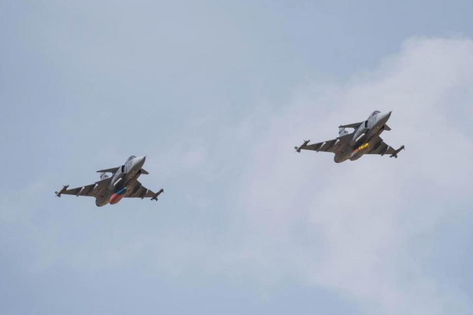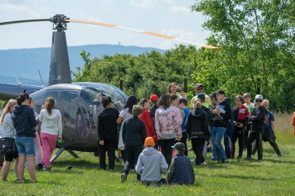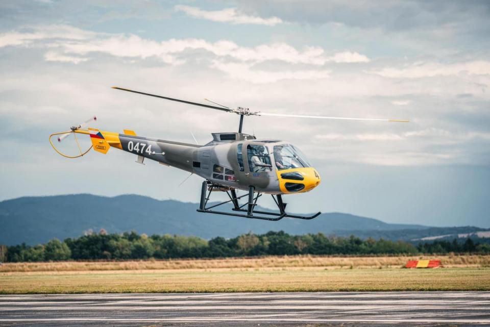 Ein grauer und gelber Hubschrauber mit der Nummer 0474 schwebt knapp über der Landebahn vor einer malerischen Landschaft mit Bergen und Wolken am Himmel beim Flugtag Eger (Cheb) 2024.