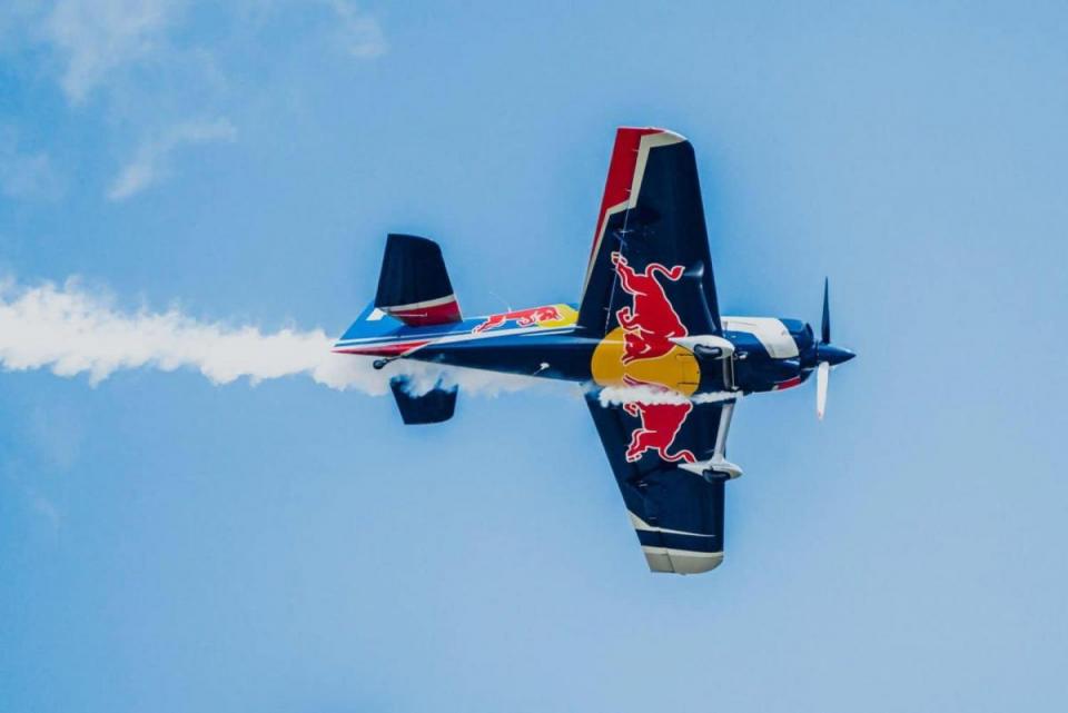 Ein Kunstflugzeug in den Farben von Red Bull (Blau, Weiß, Rot und Gelb) fliegt kopfüber am klaren blauen Himmel und hinterlässt eine weiße Rauchspur.