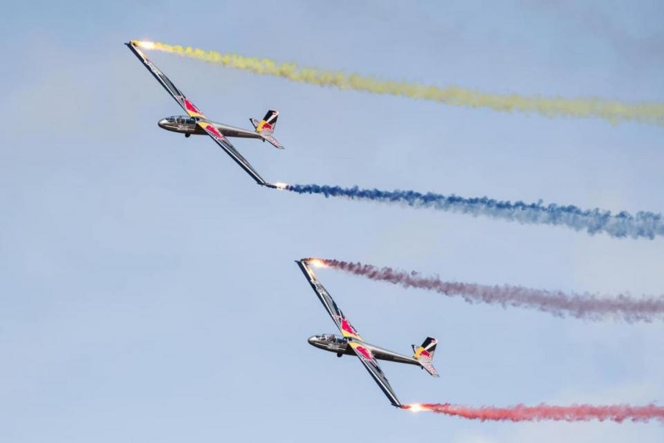 Zwei Kunstflugzeuge in den Farben von Red Bull (Blau, Weiß, Rot und Gelb) fliegen nebeneinander am blauen Himmel. Sie hinterlassen vier farbige Rauchspuren in Gelb, Blau, Lila und Rot.