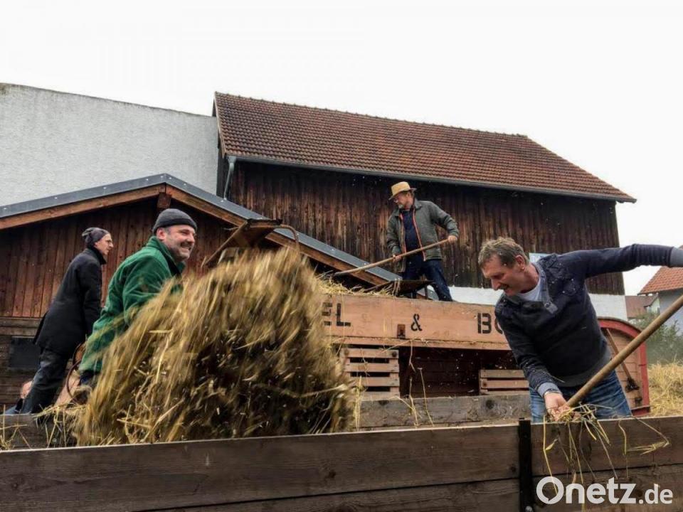 Hauptattraktion war die Dreschmaschine der örtlichen Bulldog-Freunde. Die Gruppe hatte das Modell der Firma Ködel & Böhm, Rheingau, aus seinem Dornröschenschlaf in einer Scheune in Sitzambuch geweckt und liebevoll restauriert. Beim Anblick der Maschine dachten viele Besucher an die Zeit, als es in Ehenfeld an der Straße nach Kindlas noch eine Dreschhalle gab. Dort standen zwei unterschiedlich große Dreschmaschinen, die genossenschaftlich betrieben wurden. Als in den 1970er-Jahren immer mehr Mähdrescher aufkamen, bedeutete dies das Ende für diese Geräte. Die Vorführung machte deutlich, dass Dreschmaschinen viele Vorteile gegenüber der Arbeit per Hand, aber auch sehr viel Lärm und Staub mit sich brachten.