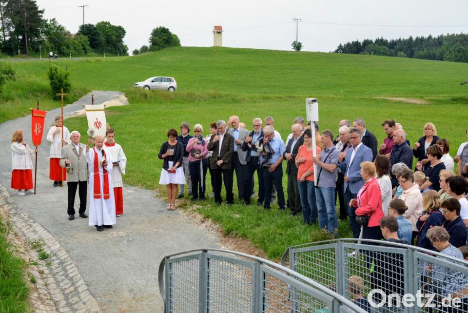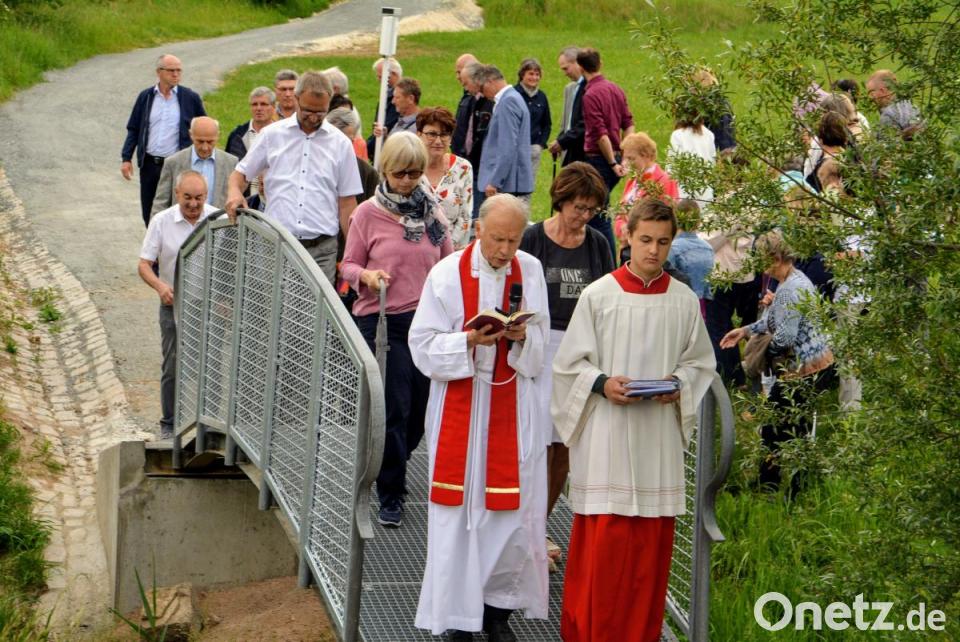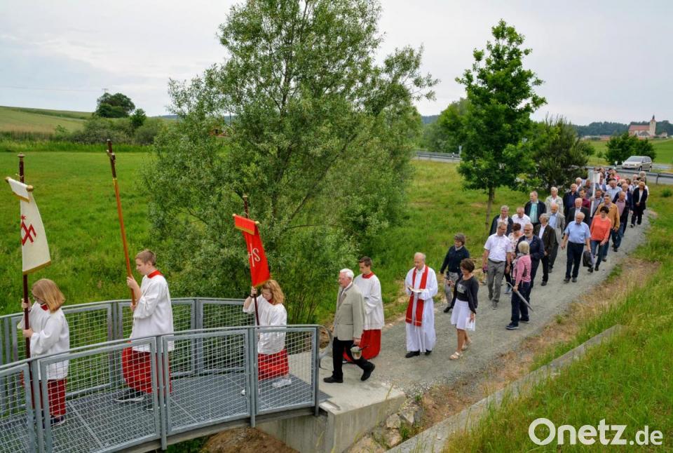 Im Rahmen der Flurprozession wurde die ca. 6,5 m lange Stahlbrücke nun geweiht und bekam von Pfarrer Hans-Peter Bergmann den kirchlichen Segen. Möge der Radweg Menschen verbinden und die Radler, die ihn benutzen immer unfallfrei unterwegs sein.