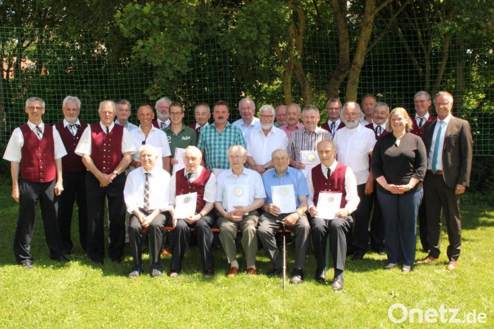 Bei der Feier wurden 30 langjährige Mitglieder ausgezeichnet: für 25 Jahre Gerhard Basler, Andreas Falk, Johann Fritsche, Uli Kummer und Richard Reich; für 50 Jahre Franz Birner, Helmut Falk, Norbert Falk, Richard Falk, Hans Falk, Georg Kustner, Bernhard Kustner, Franz Kustner, Konrad Landgraf, Anton Lohner, Heribert Meyer, Franz Schlosser, Alfred Schmalzl, Rudolf Süßer, Konrad Seidl, Alfons Wopperer, Willi Lederer, Josef Lohner und Hans Kummer; für 60 Jahre Hans Lohner, Ludwig Reich, Lorenz Kummer, Georg Schlosser und Josef Kummer; für 70 Jahre Gründungsmitglied Hans Hüttner sen. Zweiter Vorsitzender Sepp Falk bedankte sich bei Wolfgang Falk, der seit 30 Jahren umsichtig und mit ruhiger Hand den Männerchor führe.