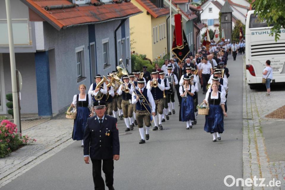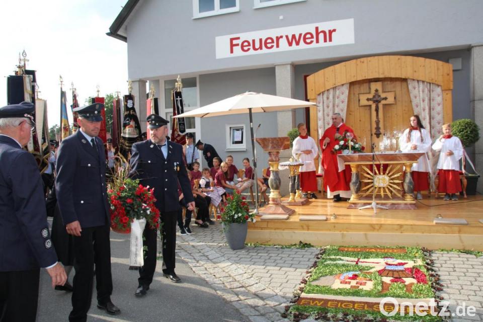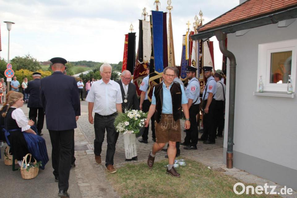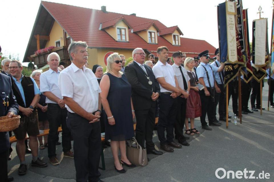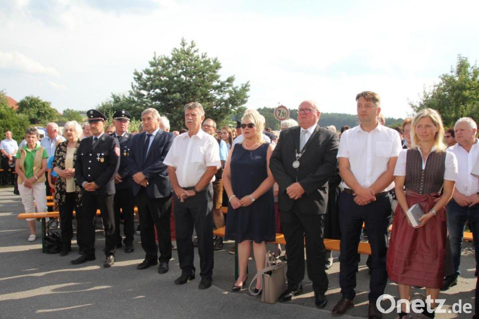 Davor hatte die Trachtenkapelle aus Österreich auf dem Dorfplatz ein zünftiges Standkonzert gegeben. Vor dem renovierten Feuerwehrgerätehaus war ein Holzaltar mit einem herrlichen Blumenteppich aufgebaut. Hier zelebrierte Stadtpfarrer Alfons Kaufmann den Festgottesdienst. Er nannte die Gründer des Vereins Idealisten, deren Werk sich bis in die heutige Zeit hinein fortsetzt. So wie die Feuerwehr für alle Gefahren und Nöte durch Ausbildung und Einsatzbereitschaft Vorsorge treffe, so sollten auch die Christen Vorsorge für das ewige Leben treffen. Nach dem Festgottesdienst galt das Gedenken den verstorbenen Feuerwehrkameraden, allen Gefallenen der Weltkriege und allen, die der Wehr nahegestanden haben. Die Feuerwehrführung und Bürgermeister Heinz Weigl legten am Ehrenmal ein Blumengebinde nieder. Kreisbrandrat Robert Heinfling gratulierte auch namens der anwesenden Feuerwehrführungskräfte, Kreisbrandinspektor Richard Fleck und Kreisbrandmeister Peter Killermann, zum Gründungsjubiläum. Er stellte sie als kleine Feuerwehr heraus, die Großes zu leisten vermag, und durch gute Jugendarbeit auch in die Zukunft investiert.