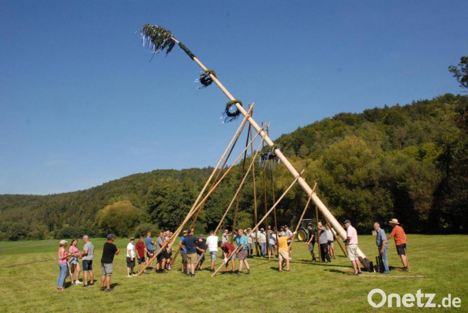 Wenn in einem Dorf wie Emhof die Kirchweih gefeiert wird, dann ist es nicht die Angelegenheit einiger weniger Leute, sondern eine Gemeinschaftsaufgabe für die ganze Dorfgemeinschaft. Dies wird besonders beim Kirwabaum-Aufstellen deutlich, denn nur gemeinsam packt man diese Aufgabe. So versammelten sich rund 30 kräftige Männer, um den Baum gen Himmel in die Senkrechte zu hieven Das geschah ausschließlich per Muskelkraft, mit vielen "Hau Ruck"-Kommandos von „Altmeister“ Rudi Werner.