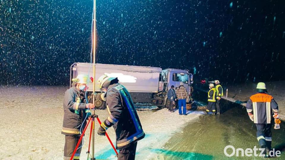 Kurze Zeit später gab es Alarm im westlichen Landkreis Amberg-Sulzbach. Wie die Polizei in Sulzbach-Rosenberg mitteilte, kam auf der Straße zwischen Sunzendorf und Högen ein 46-Jähriger mit seinem Tanklastzug ins Schleudern. Kurz vor der Abzweigung nach Kutschendorf hatte er aufgrund der schneebedeckten, glatten Fahrbahn "und einer nicht an die Fahrbahnverhältnisse angepassten Geschwindigkeit" die Kontrolle über sein Fahrzeug verloren. Nachdem er etwa 50 Meter über eine Wiese fuhr, kam der Lastwagen schließlich in einem Graben zum Stehen. "Glücklicherweise kippte das noch mit etwa 1000 Liter Heizöl befüllte Fahrzeug nicht um", berichtet die Sulzbach-Rosenberger Polizei. Der Fahrer blieb unverletzt. Trotzdem entstand an dem Fahrzeug im Frontbereich ein Schaden in Höhe von rund 30.000 Euro. Die Bergung zog sich bis 22 Uhr hin. Hervorragende Dienste leisteten laut Polizei die Feuerwehren aus Illschwang, Fürnried und Weigendorf, die mit 30 Kräften und fünf Fahrzeugen vor Ort waren. Der Fahrer des Gefahrgutfahrzeugs hätte aufgrund der schneebedeckten Fahrbahnen unverzüglich den nächsten Parkplatz aufsuchen und seine Fahrt unterbrechen oder beenden müssen, teilt die Polizei mit. Den 46-Jährigen erwartet eine Bußgeldanzeige.