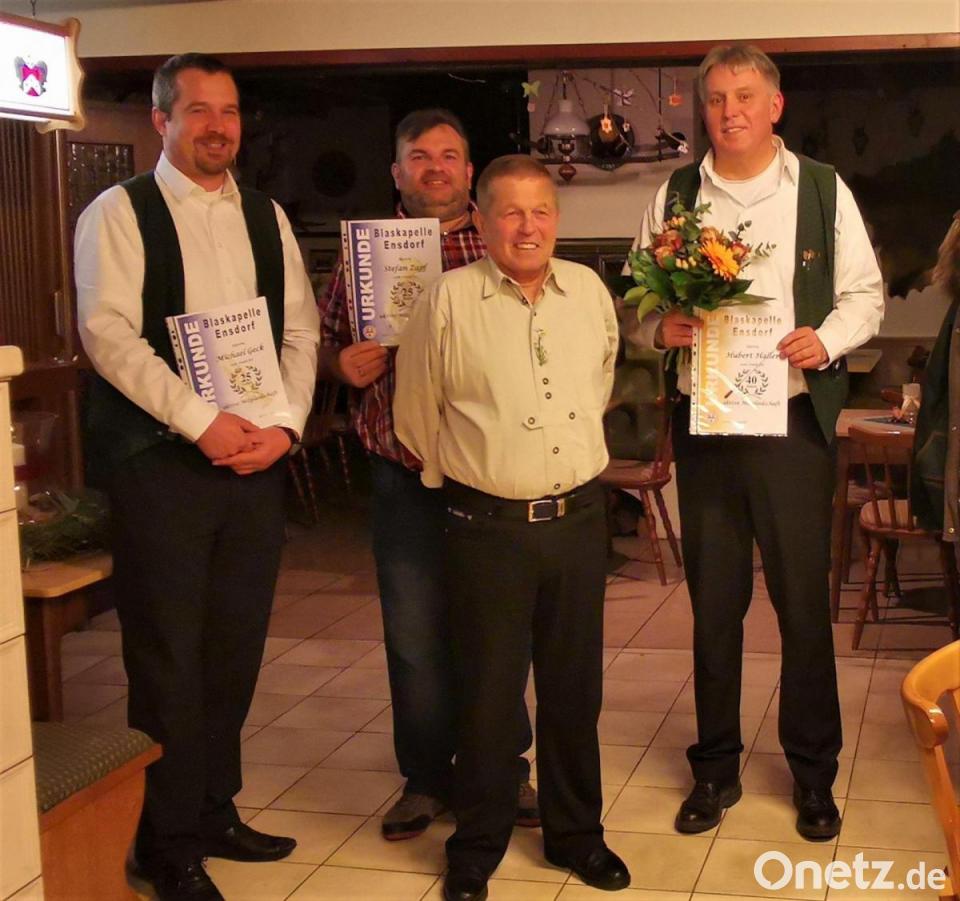 Bei der Weihnachtsfeier der Blaskapelle Ensdorf im Gasthaus Dietz stand die Ehrung langjähriger Mitglieder im Fokus. Dirigent Hubert Haller erhielt ein goldenes Abzeichen für 40 Jahre Mitgliedschaft. Irmgard Dirmeier, Georg Bayerl, Gerhard Tschaffon, Michael Geck und Stefan Zapf wurden für ihre 25-jährige Vereinstreue mit einem silbernen Abzeichen geehrt. Dirigent Hubert Haller bedankte sich bei den Musikern für ihre Treue und blickte mit ihnen auf das Jahr 2022 zurück. Insgesamt 13 Auftritte konnte die Blaskapelle trotz einiger Einschränkungen wegen der Coronapandemie spielen – unter anderem auf dem Eggenbergfest oder am Volkstrauertag. Das kommende Jahr steht ganz im Zeichen des 75. Geburtstags der Blaskapelle, der am 30. Dezember 2023 mit einem Jubiläumskonzert im Theatersaal des Bildungshauses gefeiert werden soll. Dafür brauche es im Jahresverlauf viele Proben, betonte Haller. Auch würden neue Leibchen für die Mitwirkenden angeschafft. Derzeit suche man nach einem Sponsor, der die Kosten dafür übernehme.