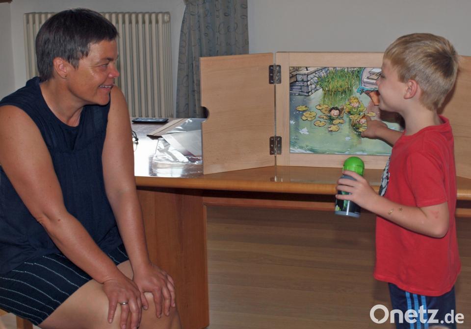 (sön) Sonja Ram trug die Geschichte "Der kleine Wassermann" von Otfried Preußler vor - für die kleinen Zuhörer eine spannende Sache. Die Bilder des Erzähltheaters Kamishibai taten das Übrige dazu. Die Kinder machten begeistert mit und wollten die Bilder genau erkunden.