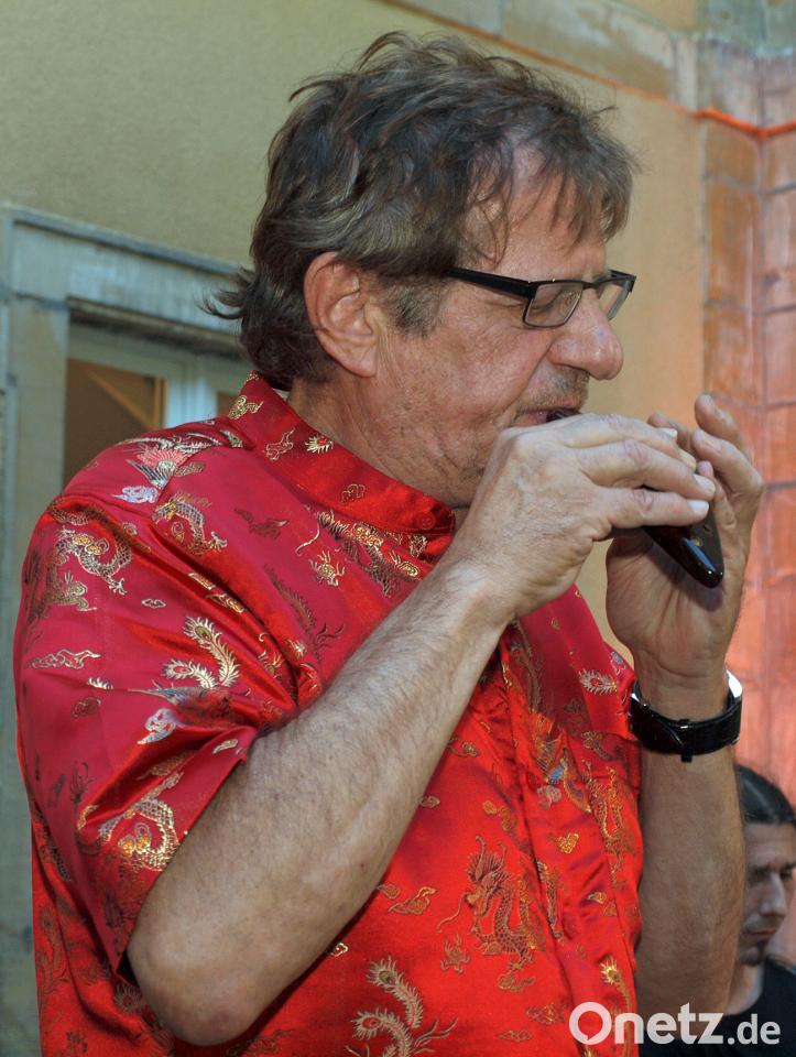 Nach einer Eigenkomposition für einen verstorbenen Kollegen, gespielt auf Okarina und Saxofon durch Heinz Grobmeier, zeigte dieser sein Können am Schlappophon, das diesen Namen hat, „da auf die Kunststoffrohre mit Badeschlappen geschlagen wird“.