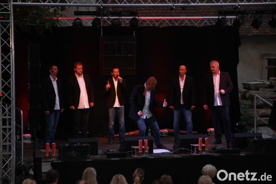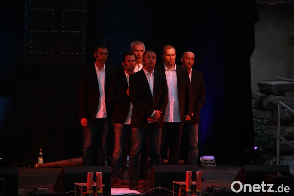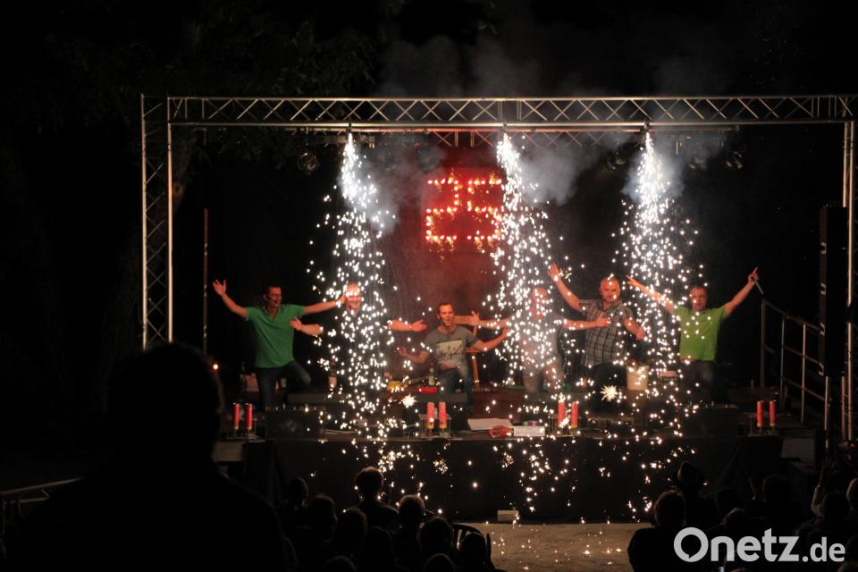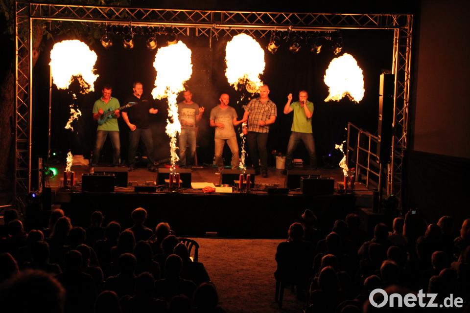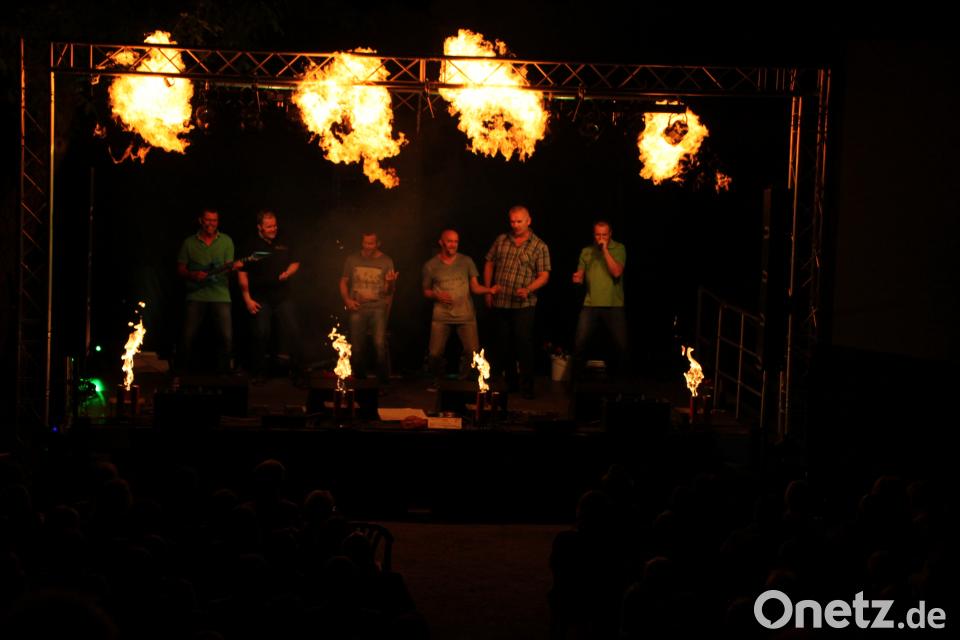 "Atemlos" staunten die Gäste nicht nur über das Lied von Helene Fischer, auch die Pyrotechnik schlug alle in den Bann. Selbst von einer brennenden Box ließ sich Sing Out nicht verwirren. Mit den aufblasbaren Gitarren aus dem Rockstück "Born to be wild" löschten sie die Flammen. Rockig ging es mit "Livin' on a prayer" weiter. "1000 Mal berührt" berührte auch die Zuhörer.