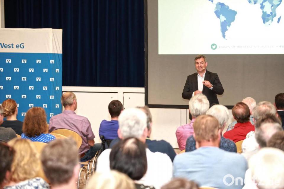 „China, Indien und die USA sehen Europa nur als Marktplatz für ihre Produkte“, sagte er. Denn Europa habe viel Geld. Deshalb müsse es sich – und damit auch Deutschland – unbedingt wirtschaftlich verändern und nachhaltiger werden. „Eine nachhaltige Wirtschaft ist der Schlüssel für die Zukunft.“ Dabei dürfe man den Begriff Nachhaltigkeit nicht allein auf den Umweltschutz reduzieren. „Nachhaltigkeit wird in den nächsten Jahren und Jahrzehnten einer der großen Wachstumsbereiche sein.“ Dabei seien Ökonomie und Ökologie kein Gegensatz. „Die beiden Themen gehören zusammen.“ Zu nachhaltigen Geldanlagen sprach er über die Kriterien für die Auswahl. „Mit Nachhaltigkeit lassen sich durchaus gute Renditen erwirtschaften.“ Nach seinem gut einstündigen Vortrag kamen zahlreiche Fragen aus den Reihen der knapp 200 Zuhörer, die der Fachmann gerne beantwortete.
