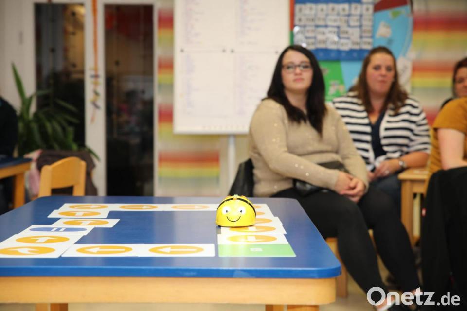 Brunhilde Minnich präsentierte den Eltern kleine Bienenroboter, die sich mit Hilfe von Tasten programmieren lassen, um ihren Weg auf Planquadraten zu gehen. „Es fördert das analytische Denken und die Problemlösekompetenz von Kindern auf spielerische Weise“, so Minnich. Selbstverständlich konnten die Eltern die kleinen Roboter, die wie Bienen aussehen, selbst testen.