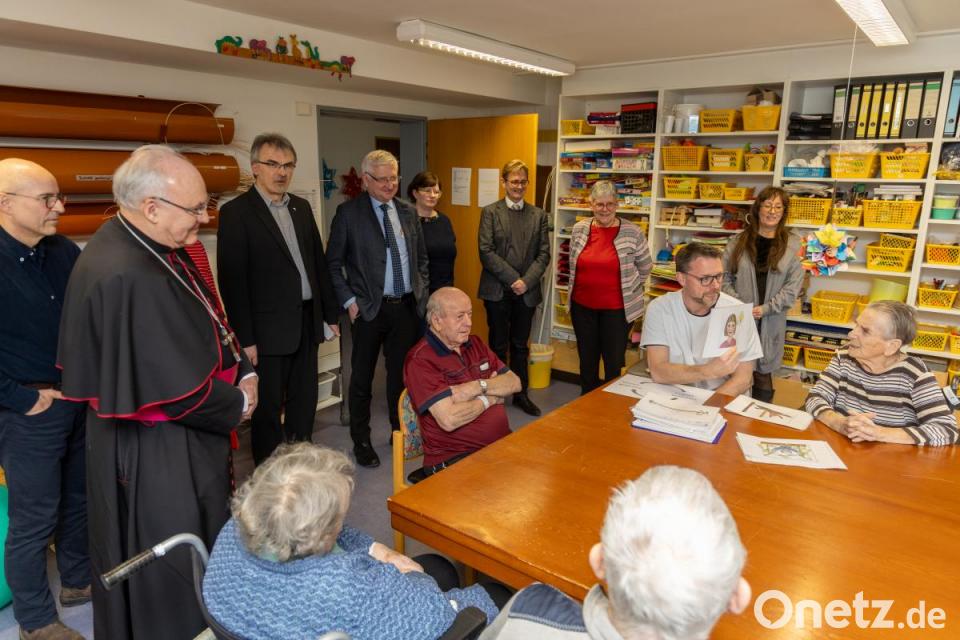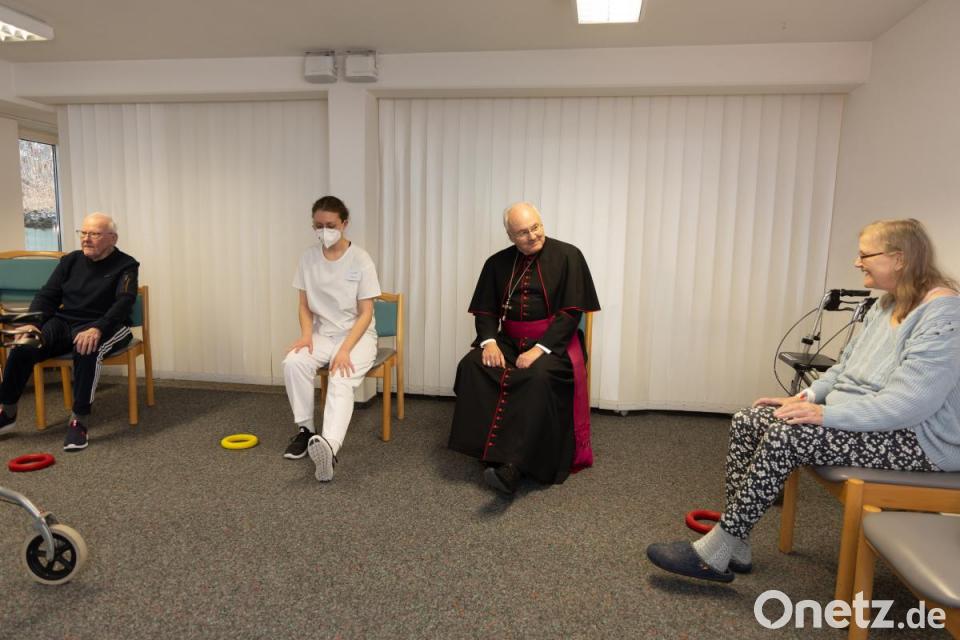 Bei einem Rundgang durch die Einrichtung besuchte der Bischof verschiedene Therapiegruppen. In der Gedächtnisgruppe beobachtete er Übungen zur Verbesserung kognitiver Fähigkeiten, während er in der Gymnastikgruppe selbst aktiv an Bewegungsübungen teilnahm, die Patienten nach Schlaganfällen bei der Wiedererlangung ihrer Koordination unterstützen.