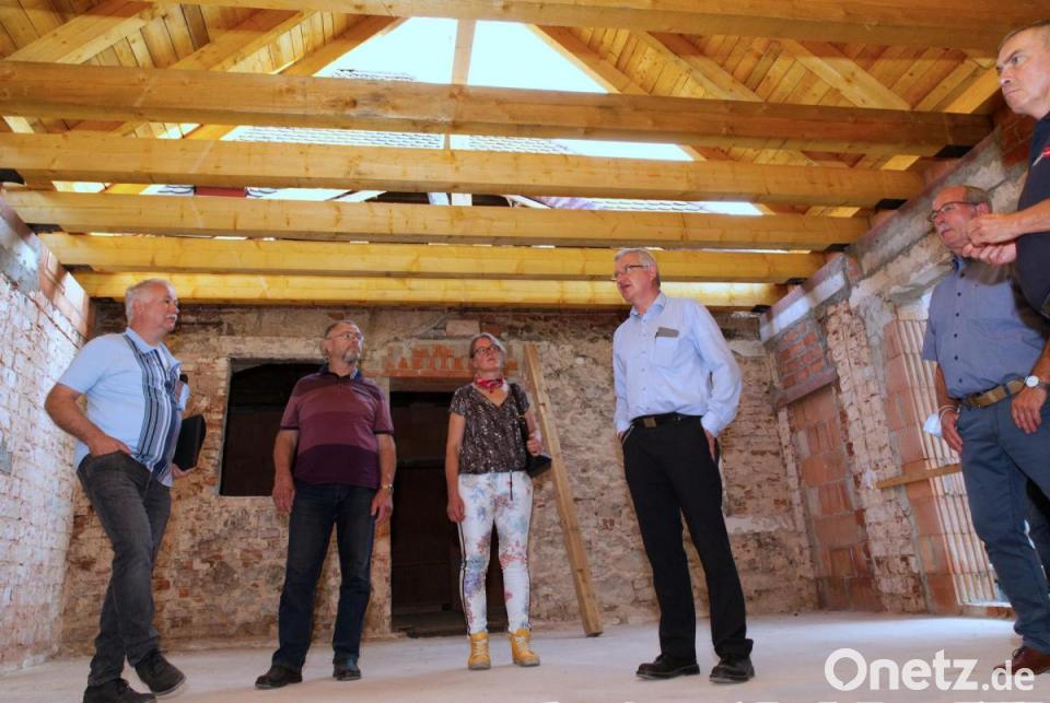 Wie Helga Rembeck ausführte, war es eine besondere Herausforderung, im Erdgeschoss die Fußböden der beiden Gebäude auf das gleiche Fußbodenniveau zu bringen. „Immerhin betrug der Höhenunterschied in den ursprünglichen Anwesen rund 30 Zentimenter.“ Besonders ging sie auf die Vorgaben des Denkmalschutzes ein, die viele Gebäudeelemente als erhaltenswert einstuften. Eine Auflage war unter anderem, wieder Holzfenster zu verwenden. „In den nächsten Tagen wird nach dem Setzen der Fenster mit den Installationsarbeiten begonnen“, führte Rembeck weiter aus. Bürgermeister Reger ergänzte, dass die Umbauphase eng mit dem zukünftigen Pächter des Hauses, dem BRK-Kreisverband Tirschenreuth, abgestimmt wurde. „Gegenüber der ursprünglichen Planung wurden so einige Raumänderungen vorgenommen, die den Bedürfnissen einer Tagespflegeeinrichtung entsprechen.“