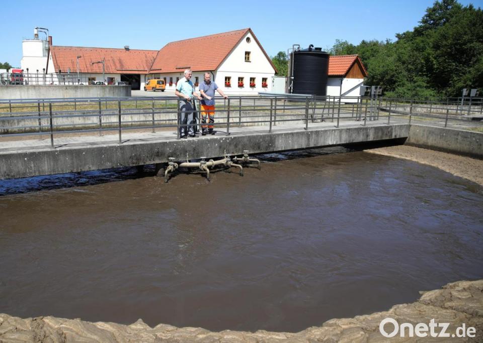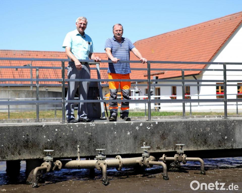 Wie es derzeit um die Kläranlage steht, davon machte sich zweiter Bürgermeister Johannes Reger ein Bild. Wie ihm Klärwärter Fütterer erklärte, machen ihm, Fütterer, die Hitzewelle und die Trockenheit bislang keine Angst. Denn im Kanal bleiben im Jahresverlauf die Temperaturen relativ konstant. „Beim Zulauf haben wir im Winter um die acht Grad, wenn es sehr heiß wird im Sommer höchstens 15 Grad“, erklärte Fütterer. „Einzig wird bei der derzeitigen Hitzewelle der Zulauf insgesamt etwas weniger.“