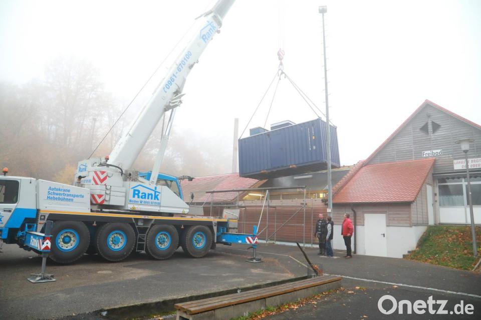 Früh morgens erfolgte nun der Ausbau des Palmöl-Kraftwerks. Die Maschine mit einem Gewicht von gut acht Tonnen hievte der Autokran mit Leichtigkeit aus dem Gebäude heraus. Anfang kommender Woche kommt der neue Motor. „Es ist ein Gas-Brennwertkessel mit einer thermischen Wärmeleistung von über 600 KW“, bestätigte der Energiewirt der Stadt und Bauamtsleiter Dieter Döppl.