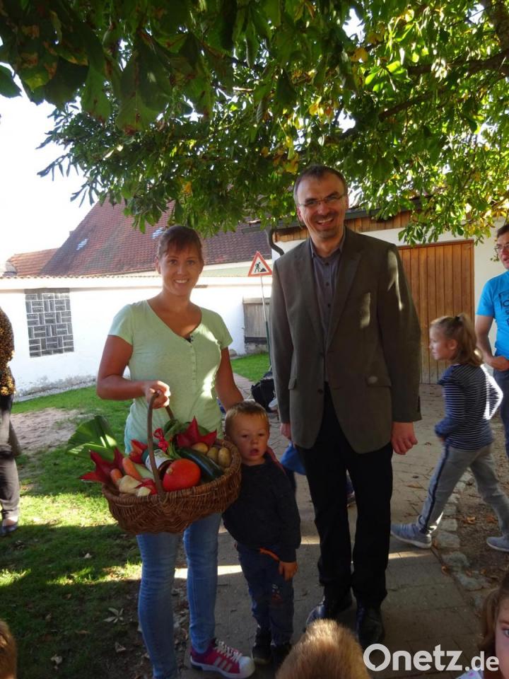 Zum Festabschluss wurde die diesjährige Schätzfrage "Wie schwer ist der Erntekorb?" gelöst. Die Gewinnerfamilie bekam den Erntekorb vom Träger der Einrichtung Pfarrer Martin Besold überreicht. "Daraus wird eine Herbstsuppe gemacht", erklärten die glücklichen Gewinner.