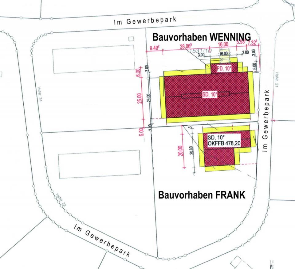 Zur Kenntnis gab der Bürgermeister auch den Bauantrag von Dominik Frank, der ebenfalls die Errichtung einer Produktionshalle mit Büroanbau im Gewerbepark 20 beabsichtigt. Die Ausmaße betragen 20 mal 28 Meter bei einer Gesamthöhe von rund 8 Meter.