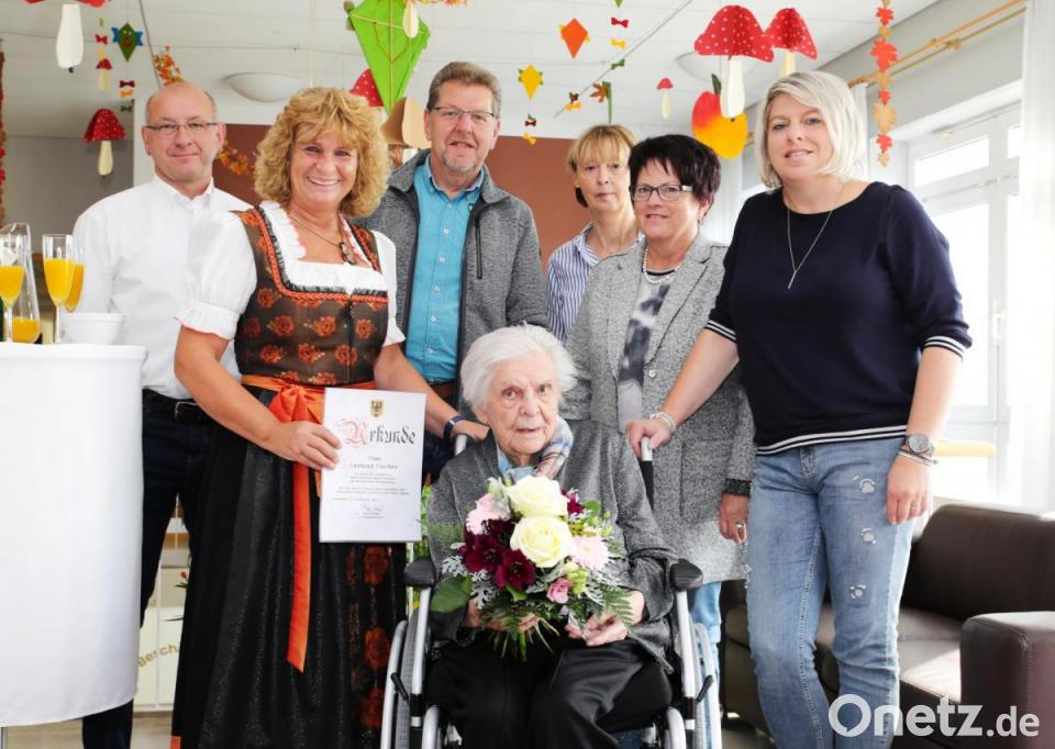 Gertrud Fischer erblickte am 21. September 1924 in Braunsdorf im Sudetenland das Licht der Welt. Noch in ihrer alten Heimat lernte sie ihren späteren Ehemann Willi Fischer kennen. Ein erstaunlicher Zufall, dass dieser den gleichen Nachnamen trug. Flucht und Vertreibung brachte die Familie von Gertrud nach Waldershof, die von Willi ins Allgäu. Die Hochzeit fand dort nach dem Krieg statt. Eine neue Heimat fand das Paar in Waldershof. Aus der Ehe ging Sohn Rudolf hervor. Ihren Lebensabend verbringt Gertrud Fischer wohlumsorgt im BRK-Seniorenwohn- und Pflegeheim in Erbendorf. Zur großen Feier war die ganze Familie mit drei Enkeln und vier Urenkeln gekommen.